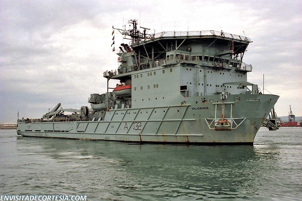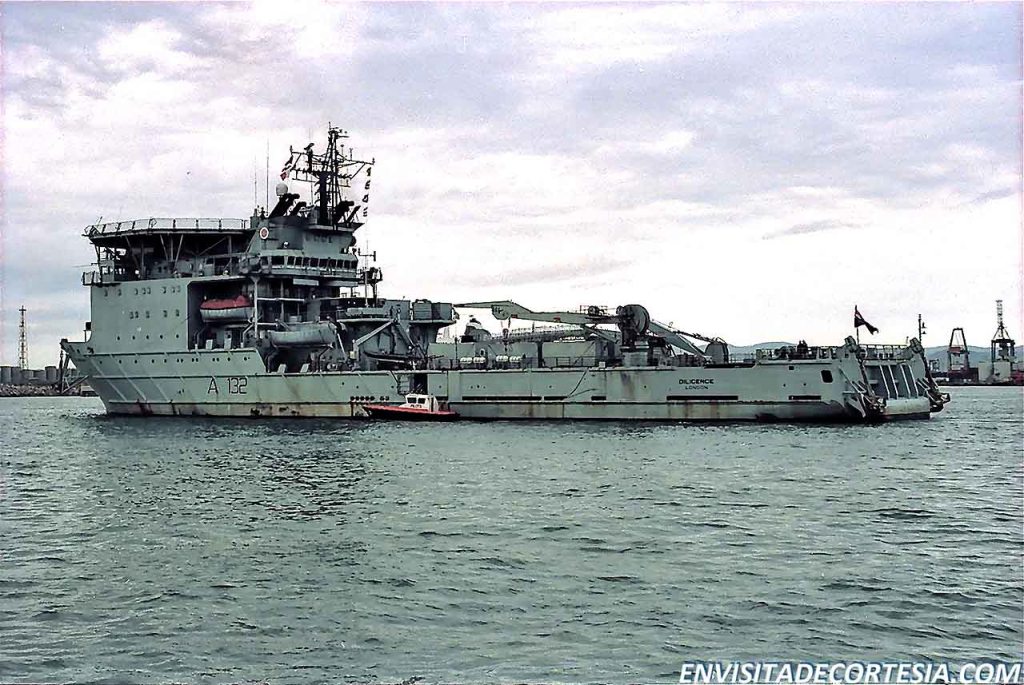 El RFA Diligence se caracterizaba por su singular belleza, su aspecto de remolcador oceánico, su plataforma de helicópteros encima del puente de mando y su gris naval lo diferenciaba del resto de buques de guerra, y de hecho eso era, al menos en principio. Fue construido como un buque de apoyo a plataformas petrolíferas, requisado por la Royal Navy para la guerra de las Malvinas y terminando sus días con la bandera de la Royal Fleet Auxliliary de la Royal Navy asistiendo con sus medios a sus buques y a los buques de sus aliados.