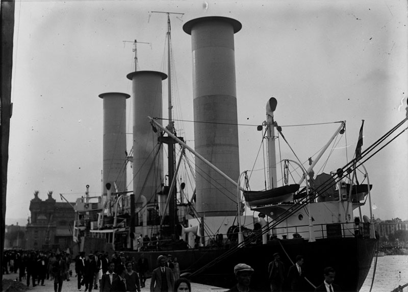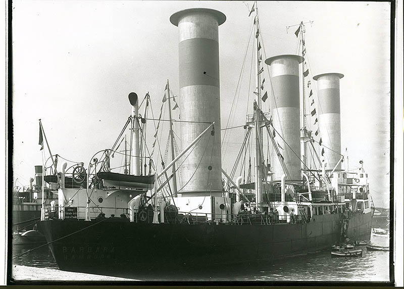 No obstante por la tarde hizo su entrada en viaje comercial un extraño vapor, su forma de barco mercante era la habitual pero no sus palos o mástiles, había algo en ellos que no acababa de cuadrar. Situados sobre el puente de mando, en crujía y cerca de la popa iban instalados tres grandes cilindros que rotaban no a mucha velocidad, dándole al barco una apariencia singular. El extraño buque atracó en un primer momento en el Muelle de Barcelona paramento norte pero tuvo que hacer un cambio de muelle más tarde, el capitán Schümann sin asistencia de remolcadores inició la maniobra y tras demostrar su destreza al timón quedó atracado de punta por popa en el Muelle Nuevo en la dársena de la Industria, allí lo estaba esperando más gente de lo habitual al tratarse de un mercante, en su popa lucía claramente su nombre: Barbara y su puerto de origen Hamburg.