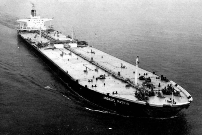 L’»Andros Patria» va patir un accident el 31 de desembre de 1978 a prop d’aigües espanyoles, davant de Galícia, mentre realitzava la ruta des de Kharg a l’Iran, fins a Rotterdam a Holanda, amb 208.000 tones de cru. Enmig d’un temporal, un cop de mar va obrir una bretxa d’uns 20 metres a l’alçada del tanc número 3, la fricció de la xapa trencada va provocar una explosió i un posterior incendi. D’un total de 33 tripulants, els serveis d’emergència només van poder rescatar amb vida 3, més els cossos sense vida d’11 tripulants més, els 19 restants van quedar desapareguts; entre els morts estaven inclosos el capità del vaixell, la seva dona i el seu fill. El petrolier va ser allunyat de la costa pels serveis d’emergència, escortats per unitats de l’Armada espanyola: pel destructor «Gravina» (D-62) i el remolcador oceànic «RA-5», i de l’Armada portuguesa la corbeta «Joao Roby» (F-487). El transvasament del combustible restant es va haver de realitzar a alta mar, no es van obtenir els permisos necessaris de les autoritats espanyoles ni portugueses, i ni de bon tros de les franceses o angleses. Un cop transvasat el combustible es va portar al petrolier a les drassanes de Lisnave Shipyards, a prop de Setúbal, a Portugal, on es va avaluar la possible reparació del vaixell; davant la magnitud dels danys es va decidir vendre’l per desballestament, que es va efectuar després de l’arribada a Barcelona el 10 de juny de 1979.