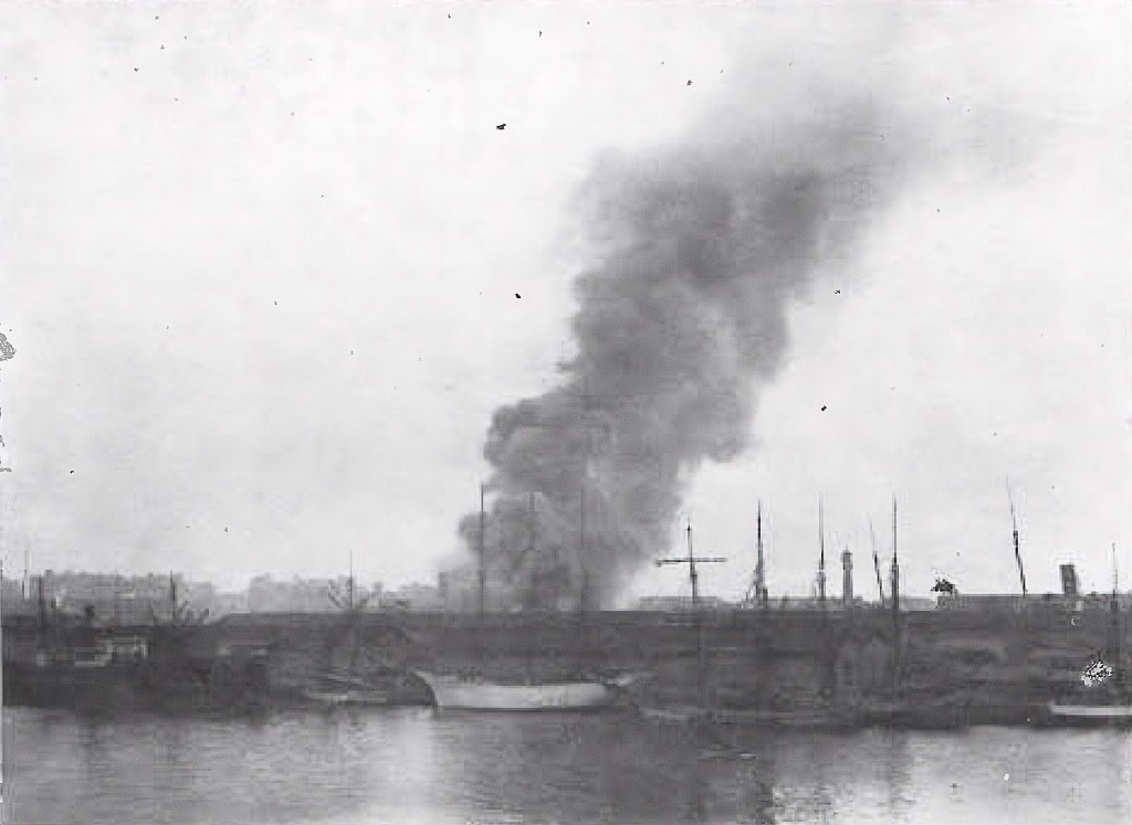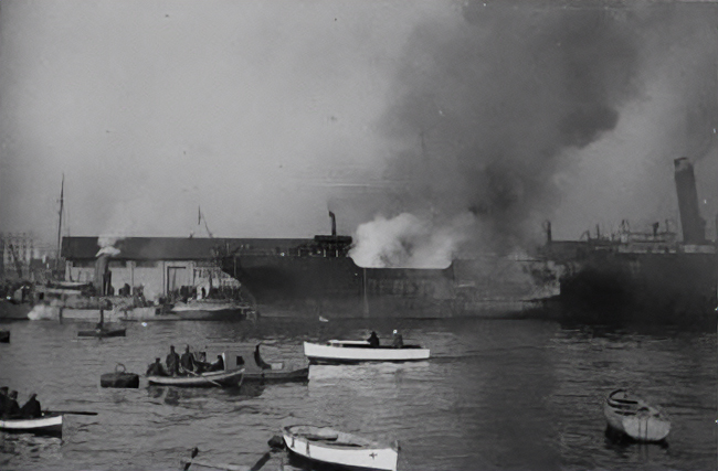 Tras la primera explosión se produjo un gran incendio en la bodega cuyas llamas alcanzaron los 25 metros de altura. Ante la conmoción que produjo la primera detonación, fueron los oficiales del Montevideo los que dieron la voz de alarma, y acto seguido los buques que se hallaban atracados y fondeados en la zona hicieron sonar sus sirenas como señal de peligro.