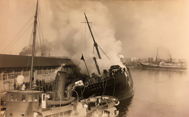 Llegada e incendio del Bankdale en Barcelona en el diario La Vanguardia del 14 de diciembre de 1923 y detalles del incendio en la Memoria de la Junta de Obras del puerto de Barcelona 1922-1923