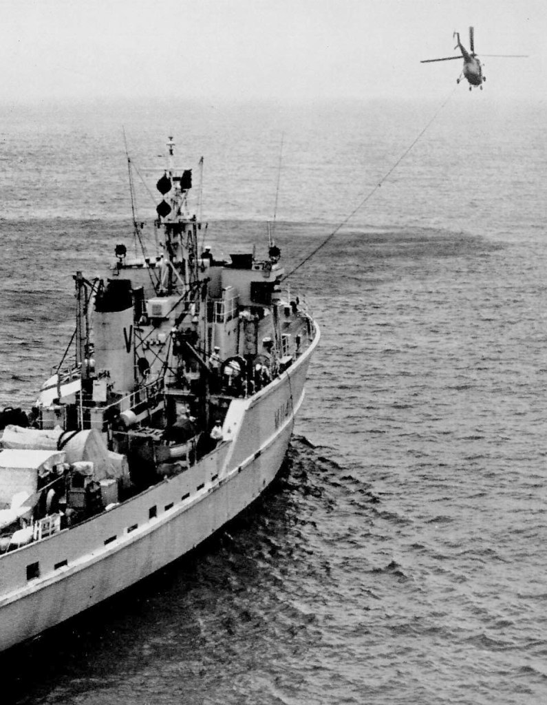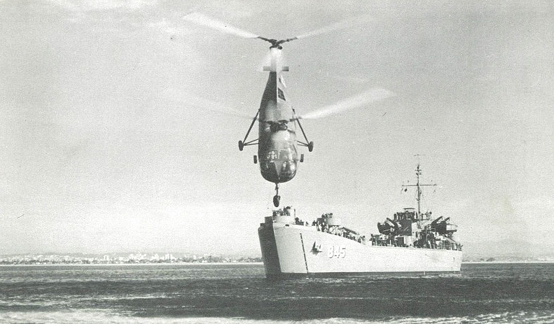 La Royal Navy también experimentó con este método, así lo prueba esta imagen del dragaminas HMS Gavinton (M-1140), que el 10 de octubre de 1957 fue remolcado por un helicóptero Westland Whirlwind logrando una velocidad de 5 nudos.