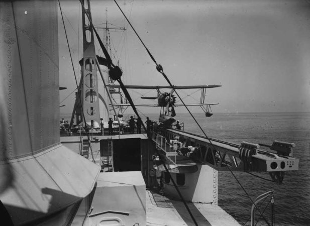 Interessant imatge on s’observa els dos avions, els seus hangars i catapultes