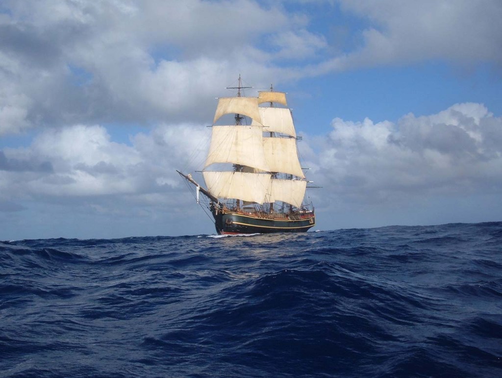 Un cop va estar acabat va partir de la localitat de Lunenburg i va posar rumb en què seria la seva primera travessia a Tahití per filmar la pel·lícula. Aniria tripulat per pescadors de la localitat on va ser construït i a més de membres de l’equip de producció.