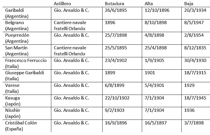 La clase «Giuseppe Garibaldi» resultó ser un diseño exitoso, y su prestigio se tradujo en exportaciones: Argentina, España y Japón, que adquirieron unidades basadas en este modelo, lo que convirtió a la clase en una de las más influyentes del cambio de siglo. En total se construyeron diez unidades, cada una con ligeras variaciones en armamento y blindaje, adaptadas a las necesidades de los países compradores.