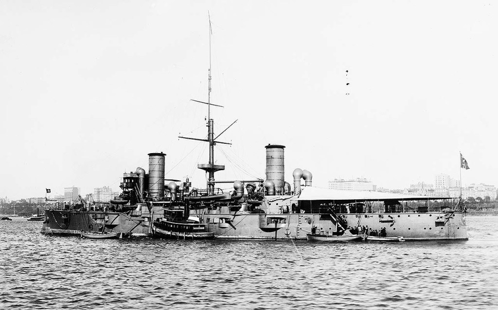 Estaba armado con un cañón sencillo de 254 mm en proa, 1 doble de 203 mm en popa; 14 de 152 mm de tiro rápido, montados en casamatas; 10 de 76 mm para la defensa contra torpederos; 6 de 47 mm de tiro rápido para la defensa a corta distancia y 4 lanzatorpedos de 450 mm, dos por banda, por encima de la línea de flotación. Su cinturón blindado era de hasta 150 mm, con cubierta y torretas protegidas.