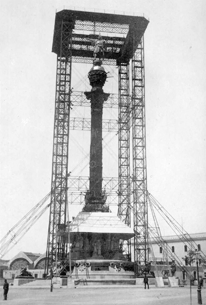 El conjunto escultórico en homenaje a Cristóbal Colón fue construido bajo la dirección del arquitecto Cayetano Buigas, con la colaboración de diversos artistas encargados de la decoración del monumento. La columna, ubicada en la confluencia de las Ramblas y el Paseo de Colón, se alza con una altura de 57,2 metros y una base de 31,5 metros, siendo prácticamente imposible no verla desde cualquier punto del Port Vell. Está construida con acero proveniente de la fundición del Arsenal Civil de Barcelona, cuyos talleres estaban situados bajo la montaña de Montjuïc, en la playa de Casa Antúnez. En su interior se instaló un ascensor que permite ascender hasta los pies de la estatua de Colón.