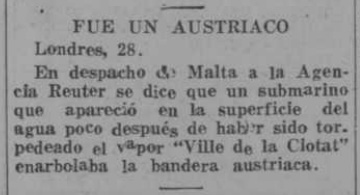 El Ville de la Ciotat va ser torpedinat pel submarí SM U-34 al comandament del tinent comandant Claus Rücker, el mateix que mesos després va causar el pànic, entre l’11 i el 12 d’abril del 1915 entre les costes de Barcelona i València. Aquest submarí formava part de la «Flota dels 30», per pertànyer a la sèrie del Tipus 31 amb els numerals: SM U-31, SM U-32, SM U-33, SM U-34, SM U-35 , SM U-38 i SM U-39.