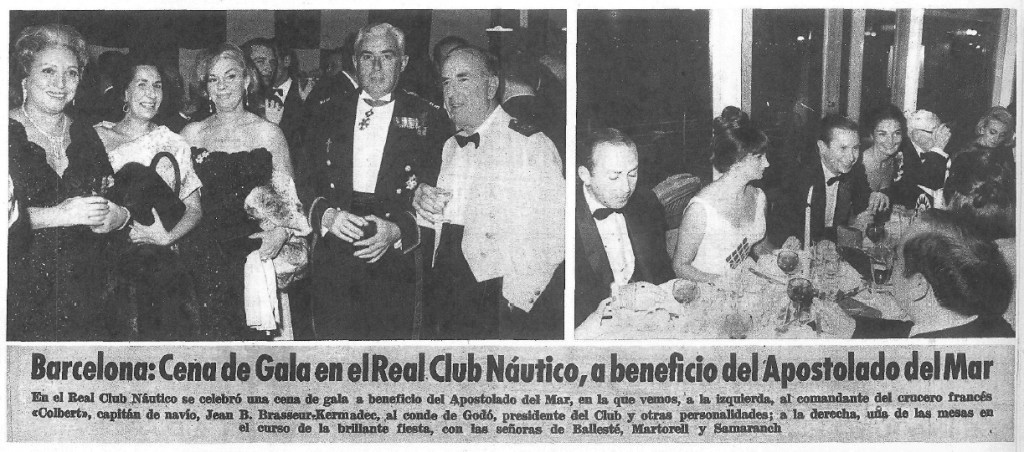 Els mariners francesos van estar poc temps a Barcelona, però l’escàs temps de què van disposar segur que fou ben aprofitat. Aquest va ser el cas del capità del Colbert, que a la seva arribada fou convidat a la festa en benefici de l’Apostolat de Mar. L’esdeveniment va tenir lloc als salons del Reial Club Nàutic i hi van assistir personalitats com el cap del Sector Naval, l’almirall senyor Jaudenes; el president del Reial Club Nàutic, el comte de Godó; el representant regional de la Delegació Nacional d’Esports, el senyor Samaranch, a més d’altres personalitats de la ciutat i les seves esposes, entre les quals destacava el capità de navili Jean Brasseur-Kermadec.