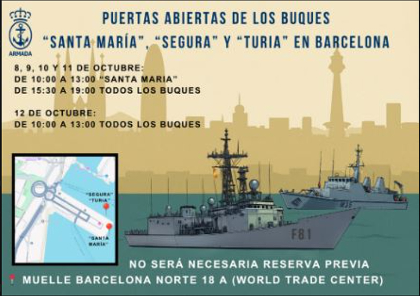 Esta flotilla de la Armada Española ha llegado a Barcelona para participar en la inauguración del Salón Náutico Internacional, coincidiendo además su estancia con la festividad de Nuestra Señora del Pilar y el Día de la Fiesta Nacional de España.