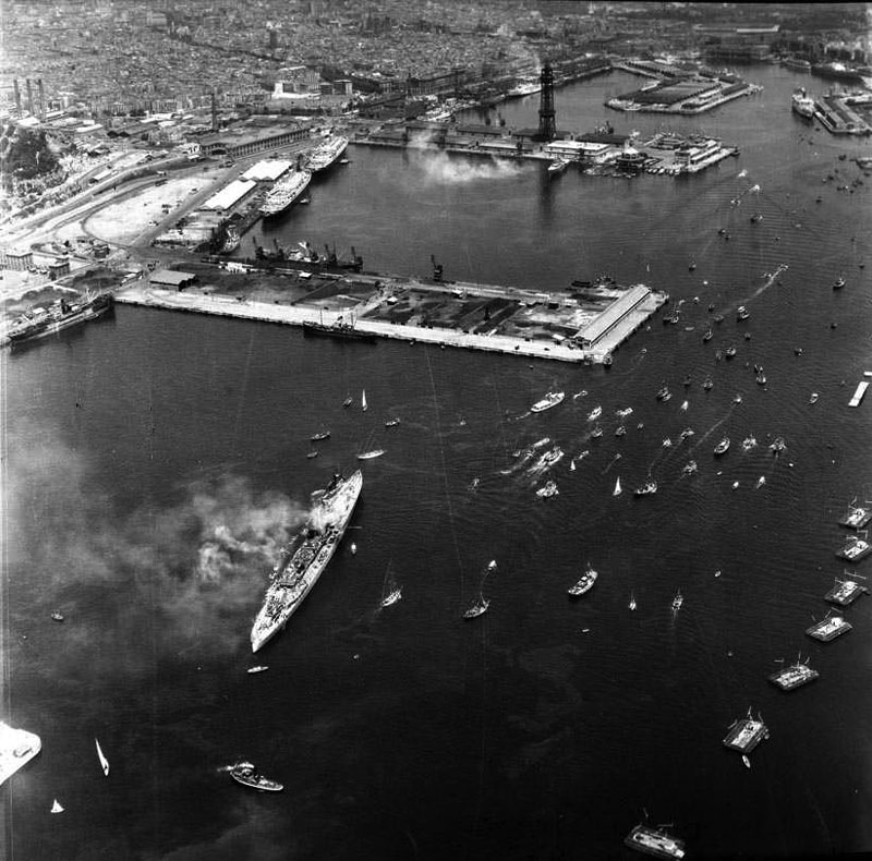 El dia 28 de maig de 1952, a les dotze del migdia, enfilava la bocana del port de Barcelona el vaixell insígnia de la Segona Flota del Mediterrani de l’Armada espanyola, el creuer Miguel de Cervantes. A bord viatjava el cap d’Estat espanyol, Francisco Franco, i la seva família, que dies abans havien embarcat al port de València amb destinació a Barcelona per participar en el XXXV Congrés Eucarístic.