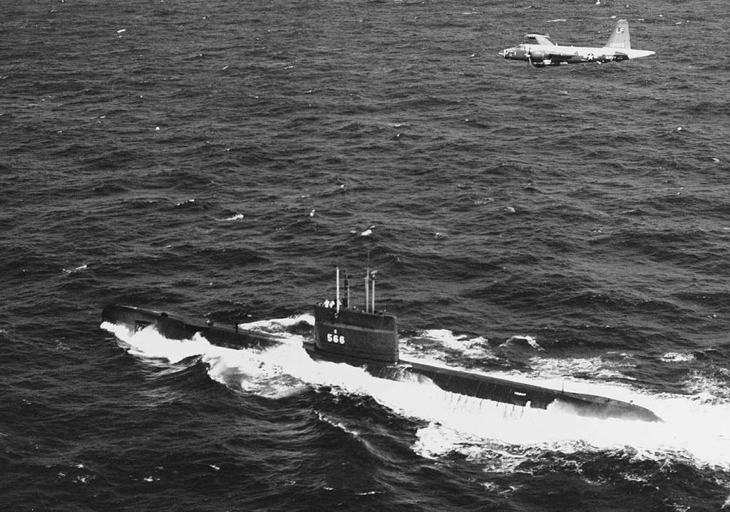 El USS Trout sobrevolado por un avión de patrulla marítima P-2H Neptune del Patrol Squadron 16