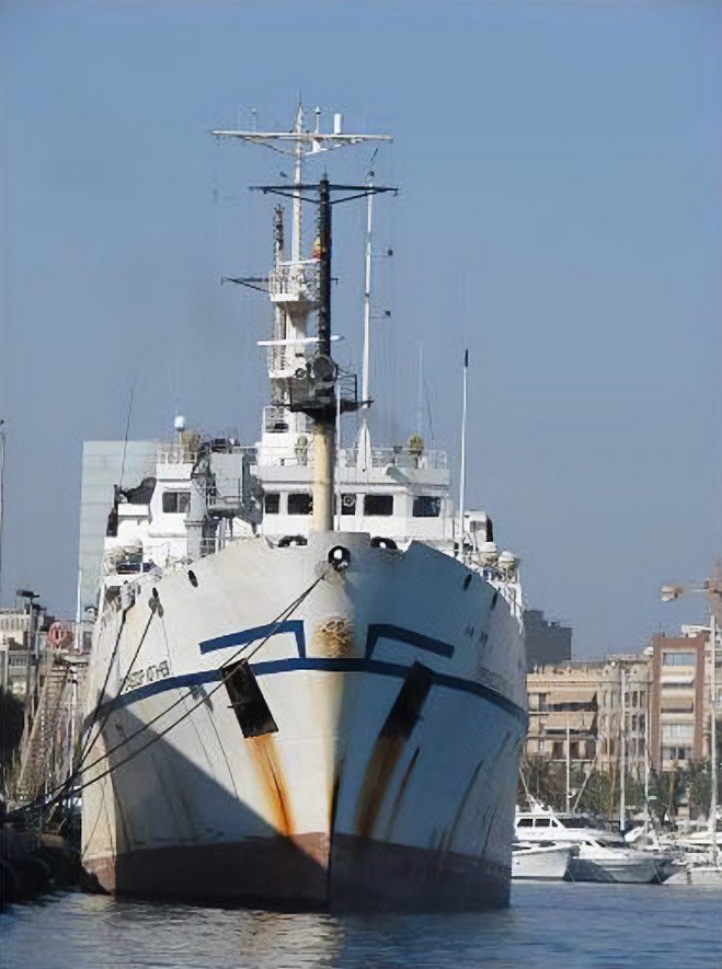 Muchas millas navegadas parecía tener el buque de investigación Professor Logachev ruso, llegado el 4 de mayo de 2006. Tras embarcar al práctico de guardia, se dirigió a su lugar de atraque asignado, el Moll d’Espanya, paramento este, junto al Centro Comercial Maremagnum.